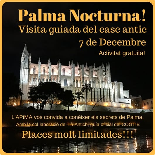 Activitat APiMA: Visita familiar a Palma Nocturna. L’APIMA vos convida a conèixer els secrets del Casc Antic de Palma. De la mà del guia oficial Tià Antich, recorrerem a peu, l’exterior de la Catedral, Palau March, Parlament, Palau del Consell, Ajuntament, Ca’n Corbella, Ca’n Forteza-Rei i l’Àguila, Plaça Major, Teatre Principal, Gran Hotel, Ca’n Berga,…
